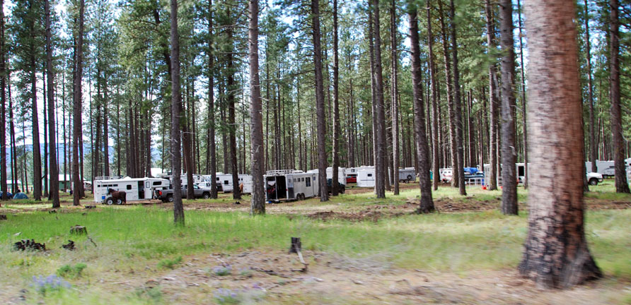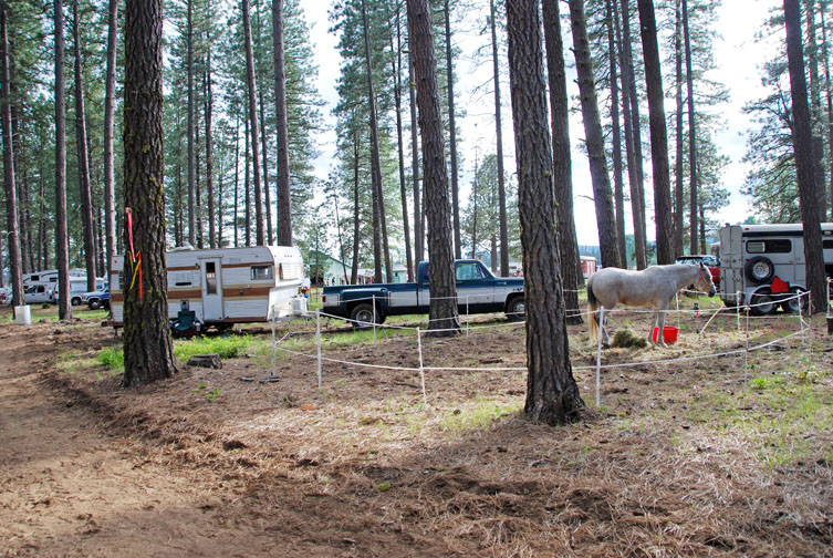 ** SUNDAY - DAY TWO ** Sunday morning I heard the rain coming down before I heard the horses warming up for the second day of riding. It was light for awhile and then it really hammered our camper. All the wind from our drive over on Friday had ripped off one of our vent covers on the roof so it was starting to leak over the kitchen, even though Matt had put on a temporary fix by using a tablecloth. Ruth had put a bowl down to catch the water. She said she wasn't getting wet, thankfully! All the whinnying had started once again as horses were left alone as their partners headed out for another day of trails. It was pretty noisy at 6 AM. I sensed the excitement as I heard the 50s trotting past our camper but we didn't get out of bed just yet. Ruth went out and took care of the horses after a bit. I got up and got dressed, took Levi to the bathroom, and then we started breakfast. We had fried egg sandwiches. I really am liking my gas range in the camper! It is so convenient. Yesterday Ruth and I had both decided not to ride the second day. Now with the rain coming down and the horses looking soaked and miserable, I was glad that was the case. We started packing up after breakfast. Before taking the corrals down we took the horses for a walk around camp. We also looked around for results but could not find any at the building, and did not see Marilyn to ask. I figured she was busy with the Day 2 ride details. It didn't take long to pack up the trucks and before long we were heading out. We took a different route home this time, turning the opposite way out of camp and heading down towards the Dalles. When we reached the Goldendale exit we turned off for gas since it was so cheap there and topped off. We lost Ruth at that point. I tried to call her but the phone was dead since it had been searching for reception all weekend. We did not have the charger with us. Doh!