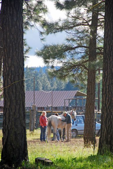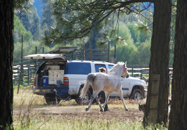 Fording that, we slowly drove around until we found an open spot amidst the trees that was suitable for both rigs. I unloaded Sinwaan and noticed right away a blemish on his back leg. I had put on his front shipping boots but not the back ones. Horrors! I helped Matt with the kids and then when they were settled in I set up the portable corral for Sinwaan and got him settled in with water and hay. Then Ruth and I walked down to the building to get registered. This ride is unusual in that they did not accept any pre-entries. So there was no requesting my favorite number and I was really curious to see what number I would end up with. I also like pre-entries because once I have my paperwork together I can mail it off and not have to worry about it again. This time I had to keep track of it, lost it once and had to print it out and fill it out all over again the day before the ride. We paid and turned in our paperwork and I was assigned #52, Ruth was #53. They told us the ride meeting would be at 8 pm and I think it was just about 6 pm at that point so we went back and got the horses.