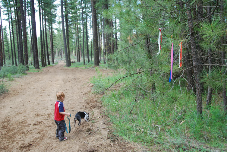 We headed down The Trail, so I could show Levi the way I had ridden out that morning. He was excited to see everything. He wanted to hold Missy's leash, and she kept stepping over it, so it was slow going as he wanted to untangle her every time it happened. I pointed out the flowers and had time to take in all the scenery that I was too excited to see earlier in the day.