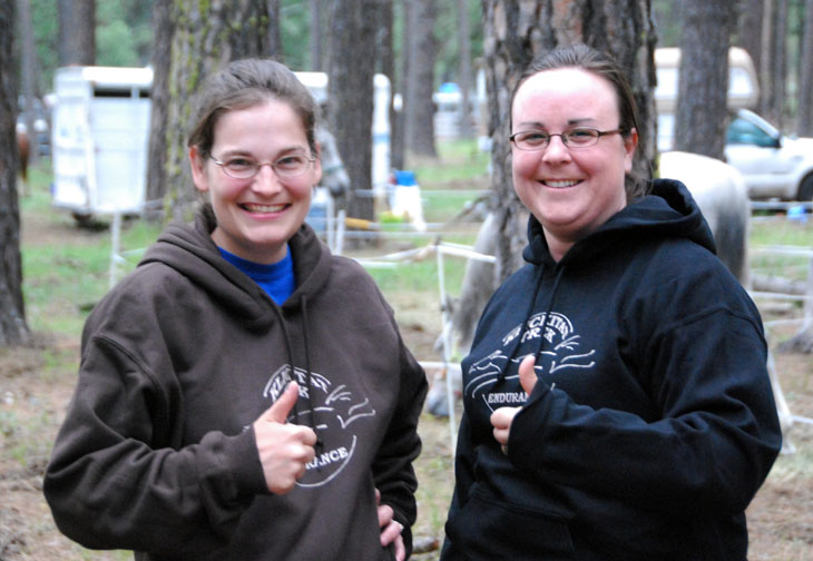 Walking back to the trailer I saw Annie on Ernie's bay Arab mare, Riyadh. She was chomping on the bit and had a hard time standing still. I told her I was ready to mount up and she was glad since her horse needed a buddy. We walked down the trail to warm up and found Ruth on foot leading Otto. We followed her back to the trailer so she could put on his bridle and from there we all rode to the start. People were warming up and milling about and some were just hanging out waiting for the trail to open. We kept our horses moving, at a walk. Annie wanted to Top Ten and we didn't want to ride that hard so she left us to chase her dreams. (Annie had skipped her high-school graduation this weekend in order to ride)