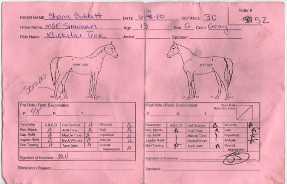 Eventually we caught up with Annie. She said the people she had been riding with wanted to go 'balls out' and she couldn't do that to this mare. She gave up on Top Ten and focused instead on finishing strong. We rode together for a couple of miles and when she got between Otto and Sinwaan, Sinwaan started lagging. The trail was getting narrow and visibility was not great. So I think he just wasn't paying attention but he stopped and started looking around. I think he lost sight of Otto. So there went his motivation. I kept him going but I was having to push him more than I liked. He whinnied a couple times but did not receive a satisfactory answer. When it opened up and I realized they had really lost us, I pushed him a little harder. His HR was looking good. We caught Annie, but not Ruth, before the finish. Annie and I walked for awhile and then we trotted a bit and then walked again when we saw camp. Dismounted and let the horses drink. Sinwaan FINALLY started tanking up. He had not had much all day, maybe a couple swallows at one tank and maybe one other swallow at the deep water crossing on the way back in. I watched my HRM as he was drinking. He was down to 71 and as he drank it went up up up to 82. I had heard that eating could do that but I didn't realize drinking would also. We walked down to the finish and the woman there was saying that we tied but one of us would have to be before the other. I don't know what she was talking about since we were LD riders and our time ends when the horses pulse down. After talking to her a minute we walked in to look for a pulser. A lady came over and asked if I needed a pulse. I looked at my HRM and it said 65. I told her he was close so she could try. It may have been two minutes and she called out "52 is down" the other person called back "1:03" I did the math quickly in my head. Left at 8 AM. In at 1 PM, that's 5 hours but subtract the 45 minute hold and we just did a 30 mile ride in 4 hr 15 min (approx.) Awesome!! I know it is tack off for the completion vet check so I asked someone if I could walk him back over to my trailer to remove it. They told me I had 30 minutes to vet through for my completion and the lines were very long. I went ahead and walked him back to the trailer anyway. We came back minus the tack and stood in line with Ruth and Annie. I looked down and noticed Sinwaan was missing a shoe!! What!? I have no idea when that happened. He never felt 'off' the whole time I was riding him. I hoped he would not be lame for the vet. Ruth and I did our vet checks almost simultaneously which worked out well for the horses. I pointed out the missing shoe to the vet right away. It did not cause a problem, he scored all A's again with one B for gut sounds. I got my vet card back so when Ruth was done and she did not get hers I asked her what was wrong. She said everything was fine. So then she asked about the card. The lady took my card at that point since she said that is what they do, we could have them back after awards.