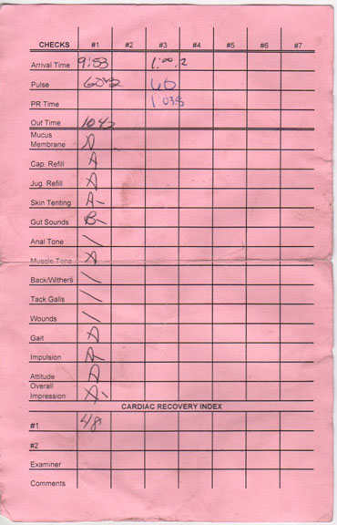 Ruth and I walked over together to vet in. Marilyn was a pulser and checked Sinwaan in at 48. She also applied his number (only to one side). I was trying to stay with Ruth for the most part so the horses would be calm (buddy system). I saw an available vet so I went over to vet through (All A's!). I think Ruth was talking to someone.