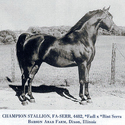 Groups Additional Information: "The first Babson Egyptian, Fa-Serr, was born in 1947. He sired 20 Black foals and no chestnuts." Fa-Serr was a National Champion and the sire of four National winners in Halter, English Pleasure, and Park. Ten of Fa-Serr's get have produced National winners and three of his sons, including Negem, are among the leading Egyptian sires of National winners. Presumed Deceased 02 Jan 1988